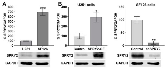 Western blot analyses of endogenous SPRY2 protein in U251 and SF126 cells and the effects of SPRY2 overexpression (SPRY2-OE) and SPRY2 short hairpin RNA (shSPRY2). (A) Endogenous SPRY2 protein is much lower in U251 cells than in SF126 cells. N = 4, mean ± SD. *** p < 0.001. (B) SPRY2-OE increased SPRY2 protein levels in U251 cells, whereas shSPRY2 reduced SPRY2 protein in SF126 cells. N = 4, mean ± SD. * p < 0.05, ** p < 0.01.