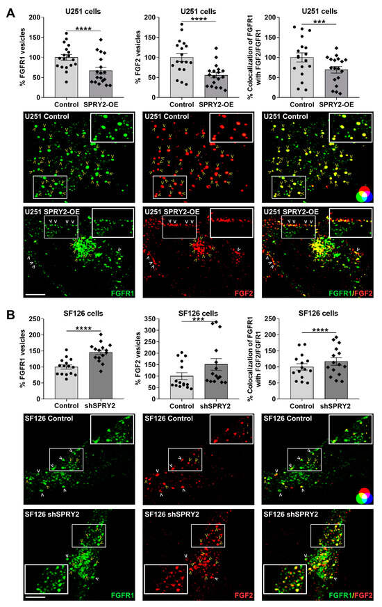 SPRY2 reduces the number of FGFR1 and FGF2 vesicles and their colocalization in U251 and SF126 cells. (A) U251 control cells with low endogenous SPRY2 level and U251 cells with SPRY2-OE were transfected with FGFR1 fused to enhanced green fluorescent protein (FGFR1-EGFP) and treated with cyanine 3-labeled FGF2 (FGF2-Cy3) for 30 min. Whole-cell analysis of confocal images revealed a reduction in FGFR1 (green) and FGF2 (red) vesicles per cell and their reduced colocalization (yellow) in response to SPRY2-OE. N = 18 experiments, mean ± SEM. *** p < 0.001, **** p < 0.0001. (B) SF126 control cells with high endogenous SPRY2 content and SF126 cells with shSPRY2 were transfected with FGFR1-EGFP and treated with FGF2-Cy3 for 30 min. Whole-cell analysis of confocal images revealed an increase in FGFR1 (green) and FGF2 (red) vesicles per cell as well as their enhanced colocalization (yellow) in response to shSPRY2. N = 15 experiments, mean ± SEM. *** p < 0.001, **** p < 0.0001. White, bold arrowheads indicate cell surface localization of FGFR1 and FGF2. Yellow arrowheads mark internalized FGFR1 vesicles colocalizing with FGF2. Scale bar = 4 µm.
