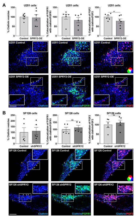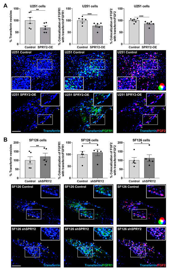 To further confirm the inhibitory effect of SPRY2 on endocytosis, fluorescently labeled transferrin-647 was added to the cells. Transferrin binds to the transferrin receptor, a transmembrane glycoprotein, and enters the cell through CME [55]. SPRY2-OE reduced the uptake of transferrin into U251 cells and the colocalization of transferrin with FGFR1 and FGF2 (Figure 6A). In SF126 cells, the number of transferrin vesicles was increased with shSPRY2, and the colocalization of transferrin with FGFR1 and FGF2 was enhanced in response to SPRY2 knockdown (Figure 6B). These data confirm the inhibitory role of SPRY2 on endocytosis.