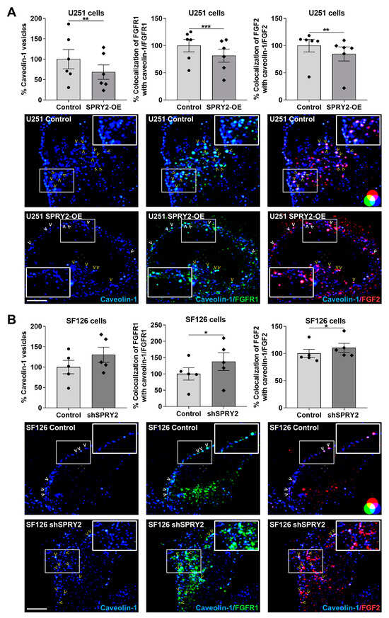 SPRY2 inhibits colocalization of caveolin-1 with FGFR1 and FGF2 in U251 and SF126 cells and reduces caveolin-1 vesicles. (A) U251 control cells with low endogenous SPRY2 level and U251 cells with SPRY2-OE were transfected with FGFR1-EGFP, treated with FGF2-Cy3 for 30 min, and immunostained against caveolin-1. Whole-cell analysis of confocal images revealed a reduction in the number of caveolin-1 vesicles per cell (blue) after SPRY2-OE. The colocalization of caveolin-1 (blue) with FGFR1 (green; colocalization with caveolin-1 = turquoise) and FGF2 (red; colocalization with caveolin-1 = magenta) was reduced in response to SPRY2-OE. N = 6 experiments, mean ± SEM. ** p < 0.01, *** p < 0.001. (B) SF126 control cells with high endogenous SPRY2 content and SF126 cells with shSPRY2 were transfected with FGFR1-EGFP, treated with FGF2-Cy3 for 30 min, and immunostained against caveolin-1. The number of caveolin-1 vesicles per cell (blue) was slightly but not significantly enhanced with shSPRY2. The colocalization of caveolin-1 (blue) with FGFR1 (green; colocalization with caveolin-1 = turquoise) and FGF2 (red; colocalization with caveolin-1 = magenta) was enhanced with shSPRY2. N = 5 experiments, mean ± SEM. * p < 0.05. White, bold arrowheads indicate cell surface localization of FGFR1 and FGF2. Yellow arrowheads mark internalized FGFR1 and FGF2 vesicles colocalizing with caveolin-1. Scale bar = 4 µm.