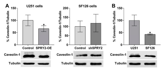 SPRY2 reduces caveolin-1 protein in U251 and SF126 cells. (A) SPRY2-OE reduced caveolin-1 protein levels in U251 cells and shSPRY2 slightly enhanced caveolin-1 protein in SF126 cells. N = 4 experiments, mean ± SD. * p < 0.05. (B) U251 cells with low endogenous SPRY2 revealed higher caveolin-1 protein levels than SF126 cells with high endogenous SPRY2. N = 4 experiments, mean ± SD. * p < 0.05.