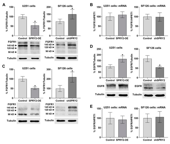 Since SPRY2-OE increases EGFR protein in other cell lines [46,47], we compared the effects of SPRY2 on FGFR1 and EGFR levels in the same GBM cell lines. In contrast to FGFR1, U251 cells with SPRY2-OE revealed enhanced EGFR protein levels, whereas SF126 cells with shSPRY2 exhibited decreased EGFR protein in cells transfected with EGFR-EGFP (Figure 7D). EGFR mRNA levels were again not changed, confirming that there is no effect of SPRY2 on EGFR transcription (Figure 7E). These results confirm the different effect of SPRY2 on FGFR1 and EGFR protein levels in GBM cell lines.