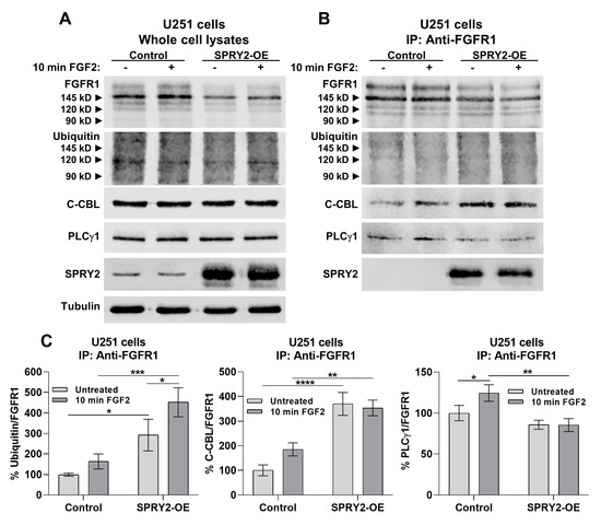 Since SPRY2-OE reduces EGFR ubiquitination in COS-1 and CHO cells [46,47], we further analyzed the ubiquitination of FGFR1 by its E3 ubiquitin ligases performing anti-FGFR1 immunoprecipitation in U251 cells. In response to SPRY2-OE, the FGFR1 levels were again reduced in untreated whole-cell lysates to 78.3% (±6.9) and to 79.9% (±5.9) after 10 min FGF2 treatment. This reduction of FGFR1 protein in response to SPRY2-OE was also detected in untreated anti-FGFR1 immunoprecipitates to 82.9% (±3.5) and to 83.4% (±3.9) with FGF2 treatment (Figure 8A,B). FGFR1 was not detected in lysates incubated with plain beads without antibody incubation (Figure S2A). Although FGFR1 was reduced in anti-FGFR1 immunoprecipitates in response to SPRY2-OE, the ubiquitination of FGFR1 was enhanced with and without FGF2 treatment (Figure 8B,C). Furthermore, the E3 ubiquitin ligase c-CBL was increased in anti-FGFR1 immunoprecipitates in response to SPRY2-OE with and without FGF2 treatment compared to naive U251 control cells (Figure 8B,C). The E3 ubiquitin ligase NEDD4 was not detected in anti-FGFR1 immunoprecipitates, although it was present in whole-cell lysates of U251 cells (Figure S2B). In addition, PLCγ1 was significantly reduced in anti-FGFR1 immunoprecipitates, and the overexpressed but not the endogenous SPRY2 was detected in anti-FGFR1 immunoprecipitates (Figure 8B,C).