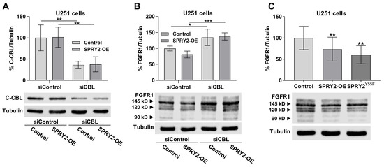 To confirm that c-CBL is involved in the enhanced degradation of FGFR1 induced by SPRY2-OE, U251 control cells and U251 cells with SPRY2-OE were transfected with siRNA against c-CBL and FGFR1-EGFP. SiCBL reduced c-CBL protein in U251 control cells and U251 cells with SPRY2-OE after 72 h (Figure 9A). Although SPRY2-OE reduced FGFR1 protein, knockdown of c-CBL increased FGFR1 protein in U251 control cells and U251 cells with SPRY2-OE to the same extent (Figure 9B). The mutant SPRY2Y55F, which is unable to bind c-CBL [48,49,50], reduced overexpressed FGFR1 in the same manner as wild-type SPRY2-OE. These results demonstrate that although c-CBL is required for the increased degradation of FGFR1 by SPRY2-OE, binding of c-CBL to SPRY2 is not involved in this mechanism (Figure 9C).