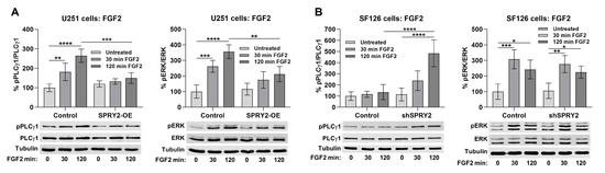 SPRY2-OE inhibits FGF2-induced activation of PLCγ1 and ERK in U251 cells, but shSPRY2 only increases FGF2-induced PLCγ1 activation in SF126 cells. (A) U251 control cells with low endogenous SPRY2 level and U251 cells with SPRY2-OE transfected with FGFR1-EGFP and treated with FGF2 for 30 and 120 min. Activation of PLCγ1 and ERK was inhibited by SPRY2-OE. N = 4 experiments, mean ± SD. ** p < 0.01, *** p < 0.001, **** p < 0.0001. (B) Naive SF126 control cells with high endogenous SPRY2 content and SF126 cells with shSPRY2 transfected with FGFR1-EGFP and treated with FGF2 for 30 and 120 min. Activation of PLCγ1 but not of ERK was elevated by shSPRY2. N = 4 experiments, mean ± SD. * p < 0.05, ** p < 0.01, *** p < 0.001, **** p < 0.0001.