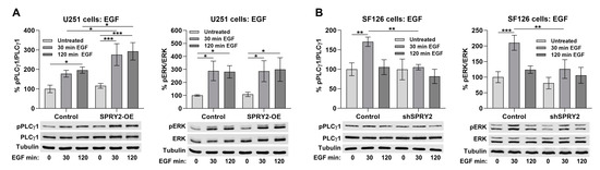 SPRY2-OE increases EGF-induced PLCγ1 signaling in U251 cells, and shSPRY2 inhibits EGF-induced PLCγ1 and ERK signaling in SF126 cells. (A) U251 control cells and U251 cells with SPRY2-OE transfected with EGFR-EGFP and treated with EGF for 30 and 120 min. Activation of PLCγ1 but not of ERK was increased by SPRY2-OE. N = 3 experiments, mean ± SD. * p < 0.05, *** p < 0.001. (B) Naive SF126 control cells and SF126 cells with shSPRY2 transfected with EGFR-EGFP and treated with EGF for 30 and 120 min. Activation of PLCγ1 and ERK was reduced by shSPRY2. N = 3 experiments, mean ± SD. ** p < 0.01, *** p < 0.001.