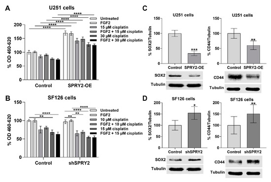 SPRY2-OE increases cell viability and reduces stemness markers in U251 cells, whereas shSPRY2 enhances cisplatin sensitivity and increases stemness markers in SF126 cells. (A) U251 control cells and U251 cells with SPRY2-OE were transfected with FGFR1-EGFP and treated with FGF2 and 15 and 30 µM cisplatin for 24 h. Cell viability of U251 cells was increased by SPRY2-OE in all groups. N = 4 experiments, mean ± SEM. **** p < 0.0001. (B) Naive SF126 control cells and SF126 cells with shSPRY2 were transfected with FGFR1-EGFP and treated with FGF2 and 10 and 15 µM cisplatin for 24 h. Cell viability of SF126 cells was not altered by shSPRY2, but cell viability was more strongly reduced by cisplatin treatment in cells with shSPRY2 than in control cells. N = 5 experiments, mean ± SEM. ** p < 0.01, **** p < 0.0001. (C) SPRY2-OE reduces SOX2 and CD44 in U251 cells overexpressing FGFR1-EGFP. N = 4 experiments, mean ± SD. ** p < 0.01, *** p < 0.001. (D) ShSPRY2 increases SOX2 and CD44 in SF126 cells overexpressing FGFR1-EGFP. N = 4 experiments, mean ± SD. * p < 0.05, ** p < 0.01.