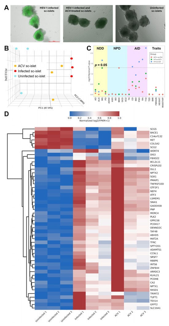 Analyses of RNA-seq data from sc-islets showed enrichment of autoimmune disease genes. (A) Images of unfixed HSV-1-infected sc-islets, HSV-1-infected and ACV-treated sc-islets, and uninfected sc-islets after 48 h. (B) PCA plot of the sc-islet RNA-seq data showing clustering of uninfected sc-islets (in blue), infected sc-islets (in red), and HSV-1-infected and ACV-treated sc-islets (in orange) along PC1 (x-axis). (C) Plot showing GSEA results from comparisons of the sc-islet RNA-seq datasets across 21 common diseases. The labels are “NDD” for neurodegenerative diseases, “NPD” for neuropsychiatric disorders, “AID” for autoimmune diseases, and “Traits” for traits and related diseases. The y-axis shows the -log10(nominal p-value from the GSEA result) and the x-axis shows each disease: AD for Alzheimer’s disease, ALS for amyotrophic lateral sclerosis, MS for multiple sclerosis, PD for Parkinson’s disease, ADHD for attention deficit hyperactivity disorder, ASD for autism spectrum disorder, BD for bipolar disorder, MDD for major depressive disorder, OCD for obsessive-compulsive disorder, SCZ for schizophrenia, TS for Tourette’s syndrome, CD for Crohn’s disease, IBD for inflammatory bowel disease, PSO for psoriasis, RA for rheumatoid arthritis, T1D for type 1 diabetes, T2D for type 2 diabetes, BMI for body mass index, FBRAIN for FMRI brain measurements, HEIGHT for height, WAISTHIP for waist-to-hip ratio. The comparison groups are: HSV-1-infected and ACV-treated versus uninfected sc-islets (ACV versus Ctrl, in red), HSV-1-infected versus HSV-1-infected and ACV-treated sc-islets (Inf versus ACV), and HSV-1-infected versus uninfected sc-islets (Inf versus Ctrl, in blue). (D) Heatmap showing the normalized log2 (FPKM+1) expression for the top 50 DEGs sorted by the adjusted p-values for uninfected sc-islets, infected sc-islets, and ACV-treated sc-islets. (E) Plot to show GSEA results from previously published RNA-seq datasets from HSV-1-infected 3D cerebral organoids. For the GSE145496 dataset, we used the 8dpi samples (mock versus HSV-1-infected) for the analyses.