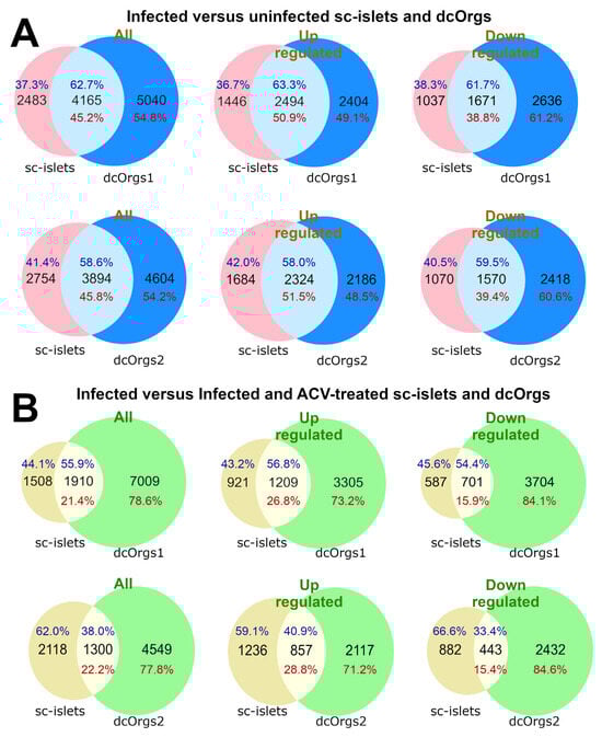 Comparisons of DEGs from HSV-1 infection in sc-islets versus two dcOrg replicates (dcOrgs1 and dcOrgs2). (A) Venn diagrams showing the numbers of HSV-1-infected versus uninfected DEGs that are common between sc-islets and dcOrgs1, as well as sc-islets and dcOrgs2. The percentages in blue text are calculated using the sc-islet DEGs, and the percentages in red text are calculated using the dcOrg DEGs. (B) Venn diagrams showing the numbers of HSV-1-infected versus HSV-1-infected and ACV-treated DEGs that are in common between sc-islets and dcOrgs1, as well as sc-islets and dcOrgs2. The percentages in blue text are calculated using the sc-islet DEGs, and the percentages in red text are calculated using the dcOrg DEGs.