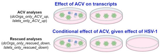 For the ACV analyses, e.g., dcOrgs_only_ACV_up and Islets_only_ACV_up, the comparisons aimed to evaluate the effect of ACV treatment on human transcripts. For instance, if the expression of a gene was up-regulated due to ACV, the HSV-1-infected and ACV-treated samples were compared with the HSV-1-infected samples. For the rescued analyses, e.g., dcOrgs_only_rescued_down and Islets_only_rescued_down, the comparisons aimed to evaluate the conditional effect of ACV treatment, given the effect of HSV-1 infection on human transcripts. For instance, if the expression of a gene was up-regulated due to HSV-1 infection, and the expression of the same gene was down-regulated by ACV treatment, then we termed the gene as a rescued gene.