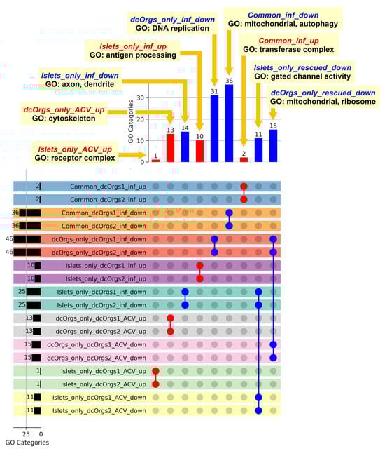 Shared GO categories across HSV-1-infected, or HSV-1-infected and ACV-treated sc-islets and dcOrgs. The bar graph on the left shows the total number of GO categories for each comparison. The bar graph at the top shows the numbers of shared GO categories across the DEG results, and the UpSet plot shows the DEG results that share these distinct GO categories. Shaded circles indicate the DEG result that shares the GO category; the red shaded circles highlight the up-regulated DEG results with the GO categories that were mentioned in the main text; the blue shaded circles highlight the down-regulated DEG results with the GO categories that were mentioned in the main text. The first four rows in the UpSet plot show the shared GO categories for the up-regulated genes in common due to HSV-1 infection in sc-islets and both sets of dcOrg replicates (Common_dcOrgs1_inf_up and Common_dcOrgs2_inf_up), down-regulated genes in common in HSV-1-infected sc-islets and both dcOrg replicates (Common_dcOrgs1_inf_down and Common_dcOrgs2_inf_down). The next eight rows in the UpSet plot show the shared GO categories for up-regulated or down-regulated genes exclusively in dcOrgs or exclusively in islets. The results for the HSV-1-infected and ACV-treated datasets are shown in the next 12 rows.