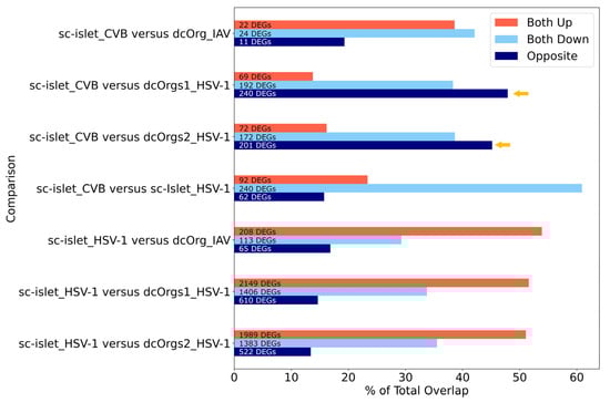 The figure shows the percentages of DEGs that were up-regulated, down-regulated or had fold change differences in opposite directions in sc-islet infected by CVB or HSV-1 or dcOrgs infected by IAV or HSV-1, both of which were normalized by the total number of DEGs. The systems with the highest discordance (dark blue bars represent opposite directions), indicated by the yellow arrows, were CVB-infected sc-islets and HSV-1-infected dcOrgs.