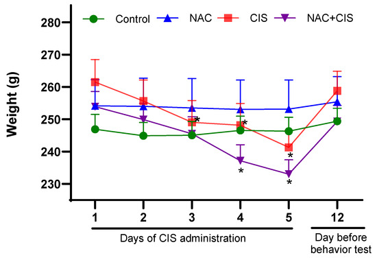Changes in body weight of rats administered with CIS and NAC. The body weight (g) of rats was monitored from the beginning of CIS administration until one day before the start of cognitive testing. The experimental groups included control (0.9% saline), CIS (3 mg/kg/5 days), NAC (300 mg/day/8 days), and NAC + CIS (NAC for 8 days, with concurrent CIS administration from days 3 to 7). Data are represented as the mean ± SEM of 10 animals per group. * p < 0.01 vs. the initial body weight within each group, based on the Friedman test with Wilcoxon signed-rank test for multiple pairwise comparisons.