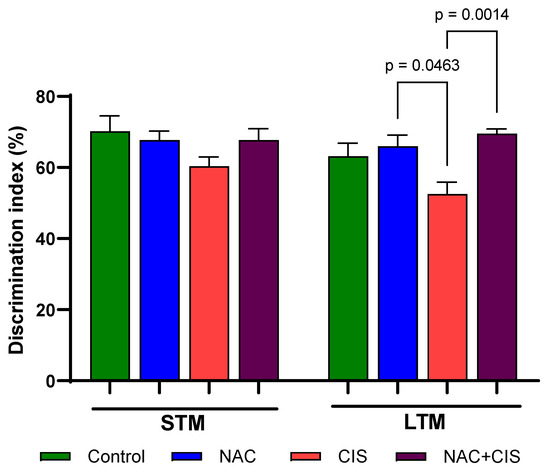 To evaluate the impact of KYNA modulation on the cognitive impairment induced by sub-chronic CIS administration, we assessed short-term memory (STM) and long-term memory (LTM) using the NORT. The discrimination index calculated as the time spent exploring the novel object relative to the total exploration time was used to evaluate memory performance (Figure 2). The results showed no significant alterations in STM across the experimental groups, although the CIS group showed a trend toward a lower discrimination index compared to the control group. In contrast, when LTM was evaluated, CIS significantly reduced the discrimination index compared to the control group (~17% vs. control). However, this reduction was significantly attenuated when NAC was co-administrated with CIS, suggesting a protective effect of NAC against the cognitive impairment induced by CIS.