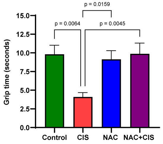 A known side effect of CIS treatment is skeletal muscle dysfunction. To evaluate this, we assessed grip strength as an indicator of muscle performance (Figure 3). The results showed that CIS reduced the grip strength by approximately 50% compared to the control group (4.1 ± 0.6 vs. 9.8 ± 1.2 s, respectively). However, co-administration of NAC with CIS completely prevented this reduction. In fact, the NAC + CIS group displayed grip strength comparable to that of the control group (9.9 ± 1.5 s). Notably, this effect was independent of body weight, as all animals across groups had similar weights at the time of the test, as shown in Figure 1.