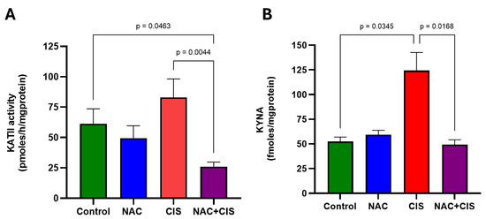 Effect of simultaneous administration of NAC and CIS on KATII activity and KYNA levels. The brain cortex was analyzed to evaluate KATII activity (A) and KYNA levels (B). Data represented as the mean ± SEM of 7 animals per group. Based on the Kruskal–Wallis test, with Dunn’s test for multiple pairwise comparisons.