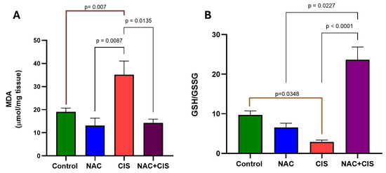 Effect of co-administration of CIS and N-acetylcysteine (NAC) on lipid peroxidation (A) and the GSH/GSSG ratio (B) induced by sub-chronic administration of cisplatin. The brain cortex was used to evaluate the redox environment. Data are represented by the mean ± SEM of 7 animals per group. Based on the Kruskal–Wallis test, followed by Dunn’s tests for multiple pairwise comparisons (in brown when comparing only vs. control).
