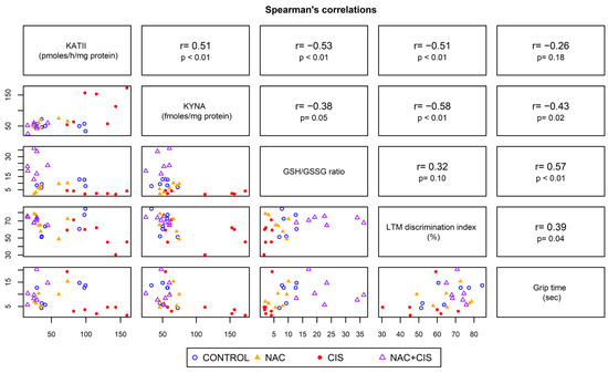Correlation between KYNA levels, KATII activity, the GSH/GSSG ratio, long-term memory, and muscle strength. The matrix in the lower left quadrant contains the scatter plot of all parameters, and the upper right quadrant contains Spearman’s coefficient (r) and is associated with a p-value (n = 7, per group).