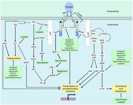 The flavonoid luteolin has gained attention for its potential to modulate FcεRI activation. Additionally, in mast cells, luteolin has been shown to have an inhibitory effect on FcεRI-mediated mast cell degranulation and MAS-related G protein-coupled receptor-X2 (MRGPRX2)-mediated mast cell activation also termed a pseudo-allergic reaction. Hao et al. [45] investigated the effects of luteolin on both FcεRI-mediated and MRGPRX2-mediated mast cell degranulation using both in vitro and in vivo models. Their findings revealed that luteolin had minimal cytotoxicity on mast cells and did not induce cell activation or intracellular calcium changes. However, pretreatment with luteolin effectively inhibited the release of histamine, β-hexosaminidase, 5-hydroxytryptamine (5-HT), and tryptase release in both anti-DNP-IgE-triggered mast cell degranulation and compound 48/80 (C48/80)-triggered mast cell degranulation, which is an agonist to MRGPRX2. In vivo mouse models of IgE-induced Type I hypersensitivity and C48/80-induced pseudo-allergic reactions showed that luteolin administration reduced paw swelling; Evans blue exudation; and serum levels of histamine, tryptase, TNF-α, MCP-1, PGD2, IL-8, and IL-13. Mechanistically, luteolin inhibited the increase in intracellular calcium levels and downregulated the activation of signaling molecules associated with mast cell activation pathways such as Lyn, Bruton’s tyrosine kinase (Btk), and PLC-γ.