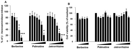 Major alkaloid compounds in fraction 2 from FAHF-2 by HPLC–inhibited mast cell degranulation in RBL-2H3 cells: (A) dose-dependent responses to berberine (1.25, 2.5, 5, and 10 µg/mL), palmatine (1.25, 2.5, 5, 10, and 40 µg/mL), and jatrorrhizine (1.25, 2.5, 5, 10, and 40 µg/mL) by RBL-2H3 cells; (B) cell viability: berberine, palmatine, and jatrorrhizine toxic effects on RBL-2H3 cells using MTT assay. * p < 0.05, *** p < 0.001 versus untreated control. Adapted with permission from ref. [33].
