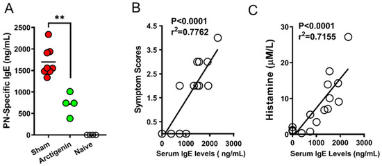 Effects of arctigenin on peanut-specific antibodies and protection of anaphylactic in a peanut-allergic mouse murine model. Serum peanut-specific IgE (A) and serum histamine (B) levels were measured by ELISA. ns means no statistical difference, ** p < 0.01 (n = 4–7). Correlations between PN-IgE and histamine levels (C) were evaluated. Each circle represents an individual mouse. Adapted with permission from ref. [40].