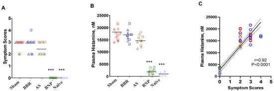 Long-term protection of berberine treatment with a boiled peanut oral immunotherapy at W30 and W70: (A) Symptom scores were assigned 30 min after the challenge using the following criteria: 0—no symptoms; 1—scratching and rubbing around the snout and head; 2—puffiness around the eyes and snout, pilar erecti, reduced activity, and/or decreased activity with increased respiratory rate; 3—wheezing, labored respiration, and cyanosis around the mouth and the tail; 4—no activity after prodding, or tremor and convulsion; 5—death. (B) Plasma histamine levels were measured by duplicate ELISA of individual plasma samples harvested from blood collected 30 min after the measurement of body temperatures. (C) Analysis of correlation between symptom scores and plasma histamine at W30 and W70 challenge time points. Color key for symbols: red—sham, blue—BBR, brown—AS, green—BNP, pink—naïve. Bars in (A) are group medians and in (B) are group means. In (C), the solid line represents the regression line, and the dashed line represents the 95% confidence interval. Red color represents sham, blue color represents BBR, tan color represents AS, green color represents BNP, and purple color represents naïve. N = 5 mice/group. Data represent 10 readouts from a combination of W30 (square symbols) and W70 (triangle symbols) challenges. *** p < 0.001 vs. sham. BBR: berberine; AS: Angelica sinensis; BNP: berberine-containing natural medicine with a boiled peanut oral immunotherapy. Adapted with permission from ref. [70].