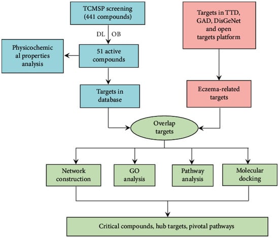 The workflow of systems pharmacology used for the analysis of the SZT formula for eczema treatment. TCMSP: TCM system pharmacology; OB: oral bioavailability; DL: drug-likeness; TTD: therapeutic target database; GAD: genetic association database; and GO: gene ontology. First, 51 active compounds of formula were selected from the TCMSP database. Their biological targets were further collected from several reliable databases. Meanwhile, physicochemical property analysis was conducted to summarize common properties of active compounds in different physicochemical parameters. Similarly, the targets involved in the pathological process of eczema were collected from related databases, including TTD, GAD, DisGeNet, and Open Targets Platform. With biological targets of compounds and related targets of eczema, their shared targets were chosen as potential therapeutic targets of SZT for eczema. Then, network construction, GO analysis, pathway analysis, and molecular docking were used to reveal the critical compounds from the SZT, the hub targets, and the pivotal regulated pathway of SZT for eczema treatment. Adapted with permission from ref. [71].