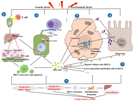 Primary biliary cholangitis (PBC), previously known as primary biliary cirrhosis, is a chronic autoimmune cholestatic liver disease that predominantly affects women [27]. Recent studies indicate that the global annual incidence of PBC is about 1.76 cases per 100,000 people [28]. In China, the incidence and prevalence of PBC is about 19.1 cases per 100,000 individuals [28]. The affected site is the intrahepatic bile ducts. Its characteristics include progressive damage to biliary epithelial cells (BECs), increased portal vein inflammation, and fibrosis [29,30]. The etiology of PBC includes genetic susceptibility and environmental factors, but it is not fully understood [29,31,32,33]. In the context of genetic and environmental risk factors for disease, T lymphocytes, which are supposed to protect the body from external bacterial and viral attacks, can instead begin to attack the small bile ducts arranged in a single layer by BECs within the liver lobules [34,35]. BECs express various molecular transport proteins, aquaporins, and ion channels that play a role in modifying the final composition and volume of bile [7]. When T lymphocytes attack BECs, some of these cells are destroyed, resulting in obstructed bile acid excretion and circulation. This disruption can cause bile to leak from the bile ducts into the blood or other liver cells, leading to cholestasis and potentially resulting in cholangitis [36]. Persistent inflammation may cause senescence and the formation of apoptotic bodies in BECs, ultimately leading to the irreversible loss of bile ducts. While BEC apoptosis can help clear harmful substances and promote autoimmunity [37,38], the inefficient phagocytosis of dead cells can activate the immune system. Defects in clearing dead BECs after apoptosis may specifically damage the small bile ducts in PBC [34]. Moreover, the chronic recruitment of immune cells may exacerbate the chronic inflammatory infiltration of BECs, leading to progressive bile duct damage [34,39]. The infiltration of mononuclear cells around hepatic bile duct epithelial cells can lead to degeneration and necrosis, resulting in chronic non-suppurative destructive cholangitis and the eventual destruction of medium and small bile ducts [40]. This persistent damage can continue to progress even after the removal of external triggers, such as viruses from resolved infections.