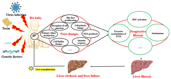 Biliary atresia (BA) is a rare pediatric liver disease that emerges in the neonatal period. It is characterized by an immune-mediated obstruction of the bile ducts, both the extrahepatic and intrahepatic bile ducts, which disrupts the normal flow of bile. It is worth noting that newborns have a certain degree of immune tolerance, which means that their immune system usually does not produce a strong immune response to their own tissues at birth. However, this tolerance is not absolute. In some cases, the newborn’s immune system may be influenced by certain factors, leading to abnormal immune responses. Studies have shown that certain environmental factors, genetic susceptibility, or infections may trigger abnormal immune responses, leading to bile duct damage and fibrosis [92]. This might explain why biliary atresia occurs despite newborns typically having immune tolerance.