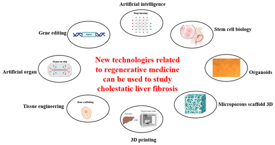 Regenerative medicine is a rapidly growing field that holds great promise in treating a variety of diseases, and indeed progressively transforming the landscape of treatments for liver fibrosis. Some new technologies related to regenerative medicine, as shown in Figure 4, can be used to study and aid in the treatment of cholestatic liver fibrosis. Recent advancements have shown that stem cell technology, combined with bioengineering and gene therapy, can create new platforms to potentially reverse liver failure and regenerate healthy cells. For instance, the development of bile duct cells from stem cells has opened new opportunities for understanding and treating liver diseases. Moreover, innovative therapies targeting the ECM are showing promise as alternatives to liver transplantation. These breakthroughs represent a significant leap forward in medical science, offering hope for more-effective and less-invasive treatments for liver conditions.