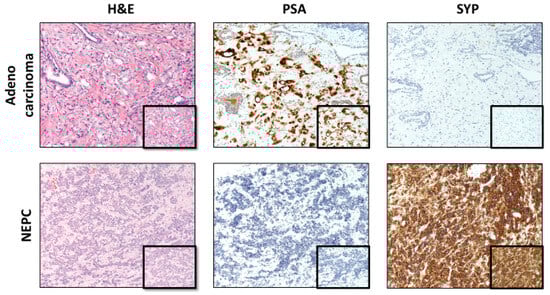 - Lee, J.K.; Phillips, J.W.; Smith, B.A.; Park, J.W.; Stoyanova, T.; McCaffrey, E.F.; Baertsch, R.; Sokolov, A.; Meyerowitz, J.G.; Mathis, C.; et al. N-Myc Drives Neuroendocrine Prostate Cancer Initiated from Human Prostate Epithelial Cells. Cancer Cell 2016, 29, 536–547. [Google Scholar] [CrossRef] [PubMed]