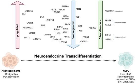NEPC is a highly proliferative disease that is negative for AR and PSA expression (Figure 1). The presence of NEPC can be suspected if there is an increase in disease burden without a concomitant rise in PSA and the emergence of metastatic deposits in visceral organs such as the lungs or liver [11]. Four core markers have been identified and are used on histology to identify NEPC in clinical samples: neuron-specific enolase (NSE), chromogranin-A (CHGA), synaptophysin (SYP), and neural cell adhesion molecule 1 (NCAM1/CD56) [10,18,19]. Other NE markers have been discovered; however, these four are the common markers that researchers and pathologists have used consistently [18,19,20]. The treatment of NEPC remains a significant clinical challenge due to its aggressive nature and resistance to conventional therapies targeting the androgen receptor (AR) signalling axis. Chemotherapy regimens, including platinum-based agents like cisplatin and etoposide, have been used with some success, reflecting treatment protocols for other neuroendocrine tumours, such as small-cell lung cancer (SCLC) [21]. NEPC generally exhibits initial sensitivity to platinum-based chemotherapy, with the objective response rates ranging from 50% to 60% [22]. While platinum-based chemotherapy can provide an initial response in some NEPC patients, the median response duration of 5.8 months, and the treatment regimen comes with a range of potential toxicities such as severe neutropenia [10]. This emphasises the need for novel targeted treatment strategies through ongoing molecular and clinical research. This review focuses on the driver landscape of t-NEPC, including tumour suppressor gene (TSG) alterations, epigenetic factors, genomic drivers, alterations in AR interactors, and other modulatory factors (summarised in Figure 2). From this point forward, t-NEPC and NEPC will be used interchangeably. Unveiling, the mechanistic underpinnings of the NE transdifferentiation process may enable the ability to estimate the risk of transdifferentiation to NEPC in patients with CRPC, and combat treatment resistance by highlighting novel druggable targets. The resistance of NEPC to standard-of-care treatment makes this variant hard to treat, and currently, there are no clinically available targeted therapies. Therefore, there is an urgent need to gain a more comprehensive understanding of this lethal variant, for example, in terms of the genetic landscape, and thus create more personalised and targeted therapies to improve the patient quality of life and longevity.
