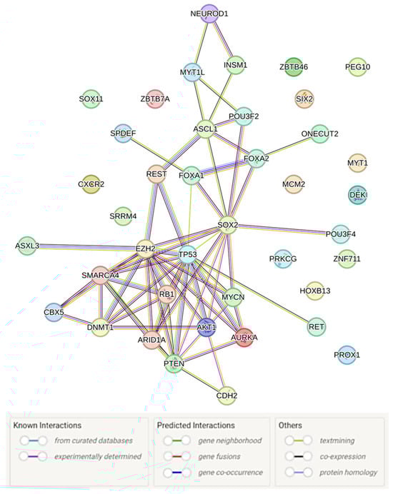NEPC is a complex disease, with increasing patient numbers due to the increased use of AR-targeted therapies, and is the subject of a growing body of scientific and medical research. The NE transdifferentiation process is not yet fully understood; however, genetic, epigenetic, and other factors described above contribute to lineage plasticity, cell cycle dysregulation, and resistance to hormone therapy (Table 1). These changes facilitate a phenotypic and lineage switch from an adenocarcinoma to a neuroendocrine phenotype. The drivers of NEPC are interconnected, often regulating each other’s expression and activity, and involve multiple biological pathways. From this, it can be deduced that the NE transdifferentiation process is multifaceted, requiring a plethora of changes in the genome and epigenome; thus, not one singular gene is responsible for these alterations. Rather, a network of genes and epigenetic factors are responsible, all with implicating effects on each other. This is confirmed by STRING network analysis (Figure 3) [154], whereby the protein–protein interaction network of the aforementioned factors is crucial for NE transdifferentiation. Focusing on central genes with high confidence scores and multiple interactions, TP53, MYCN, EZH2, and RB1 emerge as key players in NE transdifferentiation. Functional enrichment of the network shows GO biological processes for neurogenesis and negative regulation of cell differentiation, and KEGG pathways of PCa. Therefore, for the field of treatment for NEPC to progress, combination therapy targeting multiple factors and key players should be considered the most favourable approach. It can be assumed that by targeting solely one of the genetic factors discussed above, compensatory mechanisms within the tumour may occur and therefore result in resistance.
