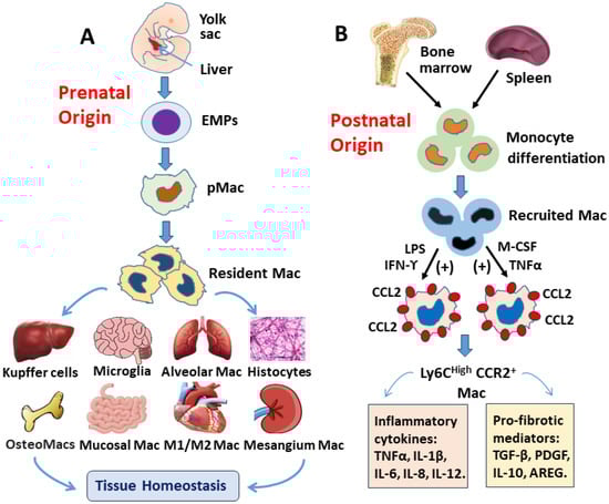 Origin and development of tissue-resident and monocyte-derived macrophages. During the prenatal period (A), the tissue-resident macrophages (Mac) are generated during embryonic development through self-renewal proliferation in the yolk sac and fetal liver from erythro-myeloid progenitors (EMPs) and pre-macrophages (pMac), which can differentiate into long-lived tissue-resident macrophages. Distinct macrophage subpopulations crosstalk with specialized tissue cells, support tissue function, and maintain homeostasis during steady-state adulthood. During the early postnatal stage (B), bone marrow-derived hematopoietic stem cells (HSCs) give rise to short-lived and long-lived macrophages through a series of sequential differentiation. Conventionally, native macrophages, stimulated by cytokine-like lipopolysaccharides (LPS), interferon (IFN), colony-stimulating factor (CSF), and tumor necrosis factor (TNF), are polarized into Ly6chighCCR2+ macrophages and release pro-inflammatory cytokines such as TNF-α, IL-1β, IL-6, IL-8, IL-12, and pro-fibrotic mediators TGF-β, IL-10, platelet derived growth factor (PDGF), and amphiregulin (AREG), which drive cell infiltration and tissue regeneration/remodeling.