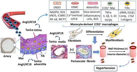 Fibroblasts, the most abundant cell type within the tunica adventitia, play a critical role in the regulation of vascular wall function. In the normotensive state, fibroblasts organize and remove extracellular matrix through the production of soluble mediators such as cytokines, growth factors, and metabolites. However, in response to Ang II-induced hypertension, adventitial fibroblasts are activated, undergo a dynamic phenotypic change, and move into the tunica media. Multiple growth factors, receptors, or TGF-β1, released from the activated fibroblasts themselves, act as the most important signal transmitters in the determination of perivascular fibrosis [73,74], where the proliferation, differentiation, and production of extracellular matrix proteins occur. The proliferated myofibroblasts in VSMCs secrete a number of vasoactive substances, such as alpha smooth muscle actin (αSMA), TGF-β1, periostin, cartilage oligomeric matrix protein (Comp), connective tissue growth factor (CTGF), and collagen I, which, collectively, affect the medial tone of VSMCs and eventually result in vascular remodeling and hypertension [75,76].