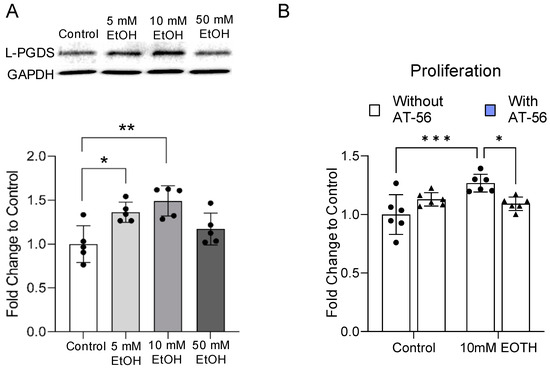 Two-hour exposure to 5 mM and 10 mM ethanol daily for 7 days upregulated L-PGDS in MBMVECs. In contrast, four-hour exposure to 50 mM once a day for 7 days did not significantly change L-PGDS protein expression (Figure 1A). On the other hand, 2 h exposure to 10 mM ethanol once a day for 7 days significantly increased the proliferation of MBMVECs in the Proliferation Assay (Figure 1B). Treatment with 1 μM AT-56 from the 6th day for two days did not significantly change proliferation in control MBMVECs but eliminated 10 mM ethanol exposure-induced proliferation (Figure 1B).