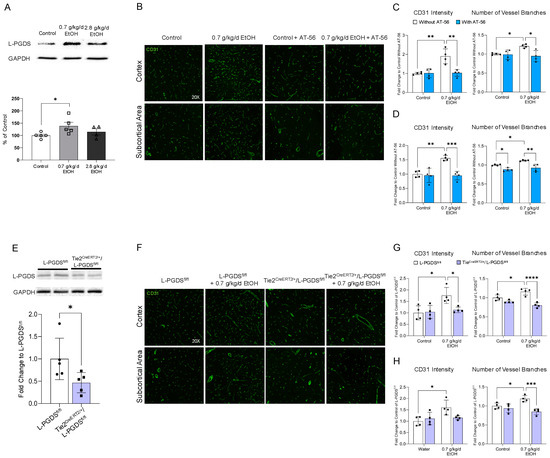 As shown in Figure 2A, 8-week daily feeding with 0.7 g/kg/day ethanol upregulated L-PGDS, whereas 2.8 g/kg/day ethanol did not significantly alter L-PGDS expression in the cerebral cortex. Similarly to the previous report [8], 8-week feeding with 0.7 g/kg/day ethanol significantly increased CD31 intensity and the number of vessel branches in the cerebral cortex and subcortical area of WT mice under physiological conditions. Four-week treatment with 30 mg/kg/day AT-56 significantly reduced the number of vessel branches in the subcortical region of control WT mice. It abolished the 0.7 g/kg/day ethanol-induced increase in CD31 intensity and vessel branches in the cerebral cortex and subcortical area (Figure 2B–D). As shown in Figure 2E, protein expression of L-PGDS in the lung was significantly reduced in 3-week tamoxifen-treated Tie2CreERT2/+/L-PGDSfl/fl mice compared to tamoxifen-treated L-PGDSfl/fl mice, indicating the success of L-PGDS conditional knockout in the endothelial cells. Similarly to those observed in the WT mice, 8-week feeding with 0.7 g/kg/day ethanol significantly increased CD31 intensity and vessel branches of the cerebral cortex and subcortical area in L-PGDSfl/fl mice under physiological conditions. However, such an increase could not be observed in 0.7 g/kg/day ethanol-fed Tie2CreERT2/+/L-PGDSfl/fl mice (Figure 2F–H).