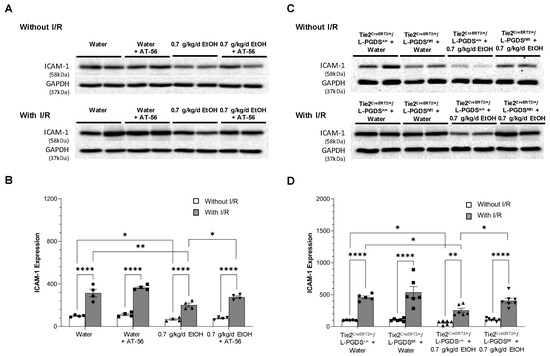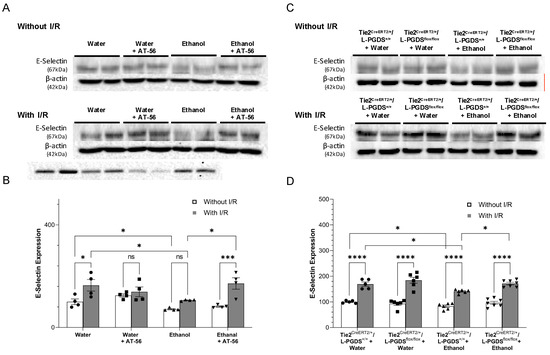 Eight-week intake of 0.7 g/kg/day ethanol slightly but significantly downregulated baseline expression of ICAM-1 (Figure 3A,B) and E-selectin (Figure 4A,B) in WT mice. Overall, 90 min MCAO/24 h reperfusion significantly upregulated ICAM-1 in control and ethanol-fed WT mice. However, the magnitude of upregulation was considerably less in ethanol-fed WT mice (Figure 3B). In addition, 90 min MCAO/24 h reperfusion significantly upregulated E-selectin in control but not ethanol-fed WT mice (Figure 4A,B). AT-56 administration prevented post-ischemic upregulation of E-selectin in control WT mice. Moreover, it abolished the inhibitory effect of 0.7 g/kg/day ethanol on ICAM-1 and E-selectin expression under physiological conditions and following ischemic stroke (Figure 3A,B and Figure 4A,B). On the other hand, the inhibitory effect of 0.7 g/kg/day ethanol on the baseline and post-ischemic expression of ICAM-1 and E-selectin was also observed in Tie2CreERT2/+/L-PGDS+/+ mice (Figure 3C,D and Figure 4C,D). However, the inhibitory effect of ethanol on both ICAM-1 and E-selectin under physiological conditions and following ischemic stroke was diminished in Tie2CreERT2/+/L-PGDSfl/fl mice (Figure 3C,D and Figure 4C,D).