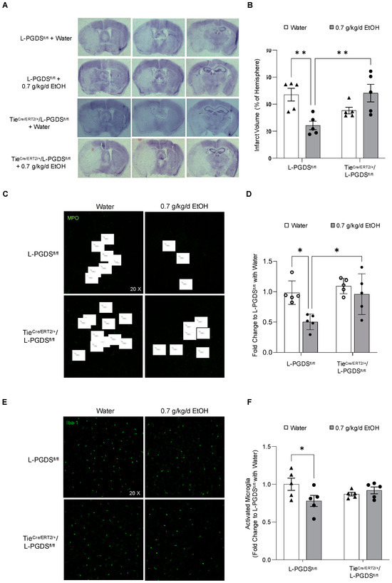 We previously reported that the 4-week administration of AT-56 attenuated the protective effect of LAC against cerebral I/R injury [17]. In the present study, we further measured the infarct size in water- and 0.7 g/kg/day ethanol-fed L-PGDSfl/fl and Tie2CreERT2/+/L-PGDSfl/fl mice. As shown in Figure 5A,B, 8-week feeding with 0.7 g/kg/day ethanol significantly reduced infarct size at 24 h of reperfusion following a 90 min MCAO in L-PGDSfl/fl mice. EC-specific L-PGDS conditional knockdown did not alter 90 min MCAO/24 h reperfusion-induced cerebral damage in water-fed mice but significantly diminished the neuroprotective effect of LAC against cerebral I/R injury. We further examined post-ischemic neutrophil infiltration and microglial activation in L-PGDSfl/fl and Tie2CreERT2/+/L-PGDSfl/fl mice. As shown in Figure 5C–F, 90 min MCAO/24 h reperfusion led to neutrophil infiltration and microglial activation in the peri-infarct cortex of both L-PGDSfl/fl and Tie2CreERT2/+/L-PGDSfl/fl mice. Compared to water-fed L-PGDSfl/fl mice; however, the magnitude of neutrophil infiltration (Figure 5C,D) and microglial activation (Figure 5E,F) was significantly less in 0.7 g/kg/day ethanol-fed L-PGDSfl/fl mice. In contrast, the difference was not observed between water- and ethanol-fed Tie2CreERT2/+/L-PGDSfl/fl mice (Figure 5C–F). However, neutrophil infiltration was significantly increased in ethanol-fed Tie2CreERT2/+/L-PGDSfl/fl mice compared to ethanol-fed L-PGDSfl/fl mice (Figure 5C,D).