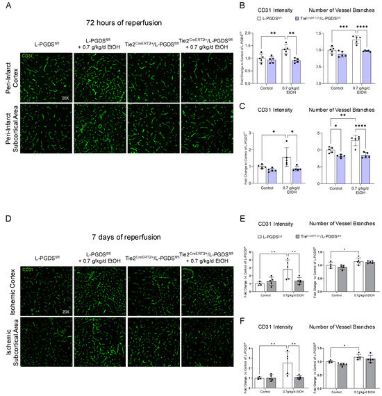 Overall, 60 min MCAO increased CD31 intensity and the number of vessel branches in the peri-infarct cortex and subcortical area at 72 h and 7 days of reperfusion (Figure 6). However, the magnitude of increase was significantly greater in 0.7 g/kg/day ethanol-fed L-PGDSfl/fl mice compared to the control L-PGDSfl/fl mice (Figure 6B,C,E,F). In addition, the ethanol-induced increase in CD31 intensity and the number of vessel branches was not observed in Tie2CreERT2/+/L-PGDSfl/fl mice at 72 h of reperfusion (Figure 6B,C). Interestingly, although the ethanol-induced increase in CD31 intensity was not found, the ethanol-induced increase in the number of vessel branches remained in Tie2CreERT2/+/L-PGDSfl/fl mice at 7 days of reperfusion (Figure 6E,F).