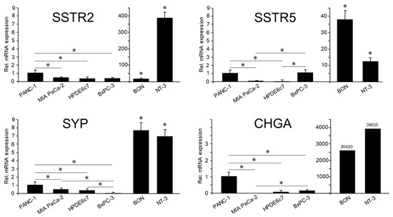 As mentioned in the Introduction, the quasi-mesenchymal cell lines PANC-1 and MIA PaCa-2 have been shown earlier to express various NED markers [3,4,5]. Here, we confirmed endogenous expression of the SYP, SSTR2, and SSTR5 genes in both cell lines by qPCR analysis, which was clearly higher in PANC-1 cells (Figure 1). This was most apparent for another prominent NED marker, CHGA, the mRNA of which was not detectable in MIA PaCa-2 cells. As positive controls, we employed the panNET cell lines, BON-1 and NT-3 [22] (Figure 1).