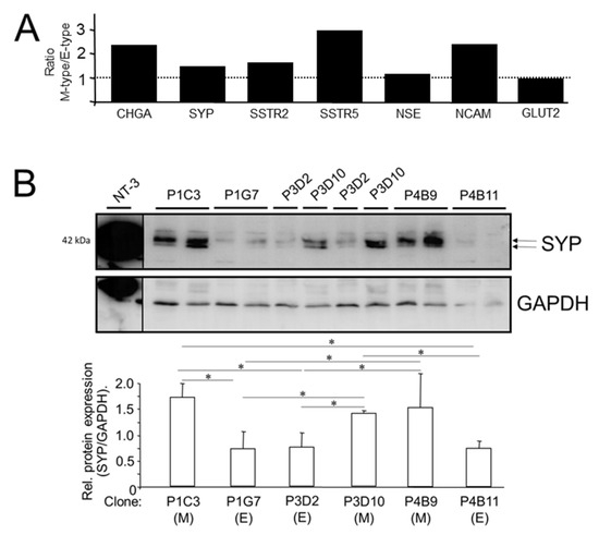 We have shown recently that the PANC-1 cell line displays EMP; parental cultures consist of clonal subpopulations with different EMT phenotypes as evidenced by different ratios of ECAD:VIM expression in single-cell-derived clones [6]. This unique feature allowed us to study the association between EMT and NED within a genetically identical background. Here, we analyzed seven clones, exhibiting either a more epithelial (E) or mesenchymal (M) phenotype, initially by qPCR analysis for expression of CHGA, SYP, NCAM, NSE, GLUT2, SSTR2, and SSTR5. Results indicate that clones with a low ECAD/VIM ratio (M-type: P1C3, P3D10, P4B9, P2E8) when compared to clones with a high ECAD/VIM ratio (E-type: P4B11, P3D2, P1G7) present with higher levels (mean ± SD) of CHGA (5.21 ± 2.1 vs. 2.26 ± 1.12), SYP (1.18 ± 0.44 vs. 0.811 ± 0.16), NSE (1.28 ± 0.35 vs. 1.16 ± 0.14), NCAM (2.04 ± 0.92 vs. 0.86 ± 0.16), SSTR2 (1.49 ± 0.42 vs. 0.92 ± 0.10), and SSTR5 (2.90 ± 1.34 vs. 0.98 ± 0.40) (Figure 2A). Yet another marker, GLUT2, was not different between M and E-type cells (0.86 ± 0.42 vs. 0.90 ± 0.19) (Figure 2A). We then performed immunoblot analysis of SYP and SSTR2. Of note, the abundance of both the SYP (Figure 2B) and SSTR2 proteins mirrored their mRNA levels (high in M-type clones P1C3, P3D10, and P4B9, low in E-type clones P1G7, P3D2, and P4B11). We conclude that NED is more pronounced in clonal subcultures with an M-phenotype when compared to those with an E-phenotype.