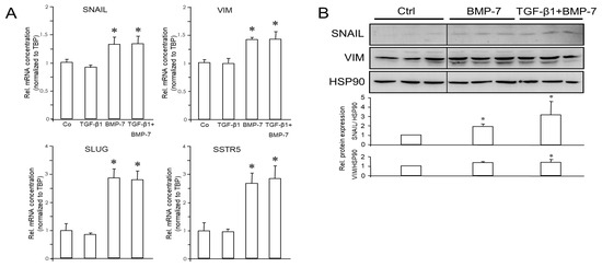 The regulatory effects of TGF-β1 and BMP-7 on EMT markers at the mRNA level were reproduced for the ECAD, RAC1b, SNAIL, and VIM proteins as shown by immunoblotting (Figure 4B). This suggested that both TGF-β1 and, unexpectedly, also BMP-7 induce EMT in PANC-1 cells and that BMP-7 can synergize with TGF-β1 in EMT induction.