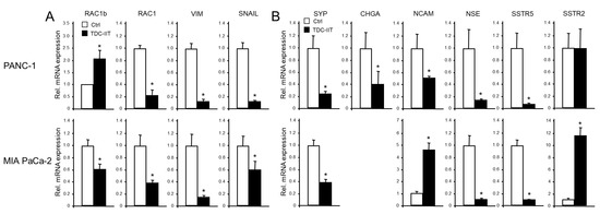 Prompted by the newly discovered positive association of EMT and TGF-β signaling with NED, we evaluated in another set of experiments the possibility that, conversely, MET in PANC-1 cells is associated with a loss of NED. In agreement with this hypothesis, we observed that during IIT-induced MET, most NED markers, except SSTR2, were downregulated along with VIM, RAC1, and SNAIL at the mRNA (Figure 5) and protein [6] levels, while concomitantly, the epithelial markers ECAD, CLDN4, GRHL2, OVOL2, CK19, and RAC1b were all upregulated [6]. This clearly shows a simultaneous loss of NED and mesenchymal markers during MET and the acquisition of an epithelial phenotype. Mechanistically, this may—at least in part—be mediated through inhibition of the SMAD2/3 arm of TGF-β signaling, since all markers that are responsive to TGF-β1 treatment were also affected by TDC-IIT but in an antagonistic fashion.