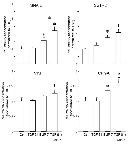 The data presented in Figure 4 and Figure 5, Figures S5 and S6 revealed that in quasi-mesenchymal PANC-1 and MIA PaCa-2, but not BxPC-3 and HPDE cells, TGF-β1 repressed epithelial genes and strongly induced mesenchymal and NED genes, except for SSTR5. In contrast, BMP-7 differentially impacted gene expression; it synergized with TGF-β1 in the induction of VIM, SNAI1, SSTR2, and ENO2 (encoding NSE) but antagonized it in the regulation of SSTR5 and CHGA (if expressed).