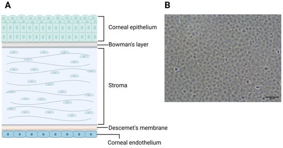 (A) Schematic showing the structure of the cornea with 3 cellular layers and 2 acellular layers of basement membrane. (B) A figure of a confluent monolayer of corneal endothelial cells in culture. Schematic created with BioRender.com.