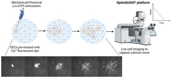 Inducing and capturing CWs in primary CECs is a sophisticated process that involves a series of steps to stimulate these cells and then visualize the resulting calcium signals (Figure 2), for example, Ternion’s modular high speed and high-resolution live imaging platform, OptioQUANT [], to study the physiological and pathological responses of cultured primary human CECs (Figure 2). When stimulating CECs to induce CWs, several established methods may be exploited to mimic natural cellular responses to activate specific pathways.