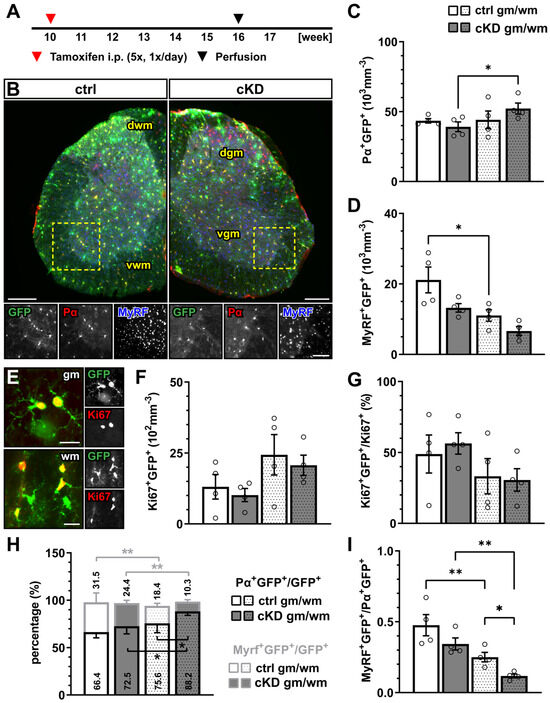 Anesthetized animals were transcardially perfused with phosphate-buffered saline (PBS) and tissue was fixed by 4% formaldehyde perfusion. After 24 h post fixation in 4% formaldehyde, T13–L1 spinal cord segments were dissected and detached from meninges. The spinal cord tissue was maintained in PBS and cut in transversal sections (40 µm) using a vibratome (VT1000 S) (Leica, Nußloch, Germany). Free-floating slices were processed as described before [57]. Briefly, incubation in blocking solution (Triton X-100, horse serum and PBS) at room temperature (RT) was followed by primary antibody solution incubation overnight at 4 °C for detection of the following markers: monoclonal mouse: anti-APC CC-1 (1:50, Cat. No. OP80, Merck, KGaA, Darmstadt, Germany; anti-MBP (1:500, clone SMI99, Biolegend, San Diego, CA, USA); monoclonal rat: anti-Ki67 (1:500, Cat. No. 14-5698-82, Thermo Fisher Scientific, Waltham, MS, USA); polyclonal rabbit: anti-MyRF (1:500, Cat. No. OB-PRB007, Oasis Biofarm, Hangzhou, China), and anti-Olig2 (1:1000, Cat. No. AB9610, Merck, KGaA, Darmstadt, Germany); polyclonal goat: anti-GFAP (1:1000, ab53554, Abcam, Cambridge, UK), anti-Iba1 (1:1000, ab5076, Abcam, Cambridge, UK), and anti-PDGFRα (1:1000, Cat. No. AF1062, R&D Systems, Minneapolis, MN, USA); and polyclonal chicken: anti-GFP (1:1000, Cat. No. 10524234, Fisher Scientific GmbH, Schwerte, Germany), and anti-NF (1:500, ab4680, Abcam, Abcam, Cambridge, UK). For MBP myelin staining, sections were pretreated with ethanol (>99%) for 10 min prior to incubation in blocking solution. Secondary antibodies (donkey secondary antibodies conjugated with Alexa488, Alexa555, Alexa647, and Alexa750; 1:2.000 in PBS; Invitrogen, Grand Island, NY, USA and goat secondary antibody conjugated with Cy5, 1:1000 in PBS, Biozol, Eching, Germany) were incubated for 2 h at RT in the dark.
