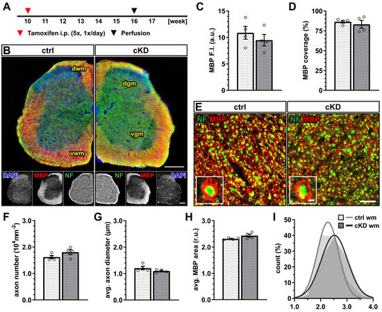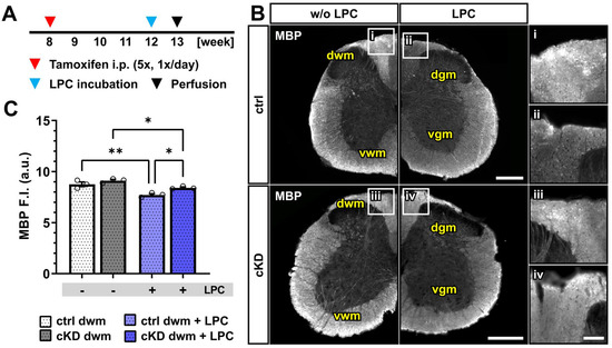 s of the lumbar spinal cord was used to evaluate the effect of acute demyelinating insults on the spinal dorsal white matter in control and cKD mice (Figure 5A). Contrary to the cuprizone model, LPC directly acts on immune cells, being a direct activator for monocytes, macrophages, and lymphocytes [64,65,66]. Therefore, inflammation is a predominant component of the model next to the direct detergent effect of LPC on oligodendrocytes. In line with this, we detected a strong glial response upon LPC incubation on the superficial layers of the dorsal white matter tracts in control and cKD mice (Supplementary Figure S6A,B), both in terms of astroglial GFAP expression (Supplementary Figure S6C,D) and Iba1+ microglia activation (Supplementary Figure S6E,F).