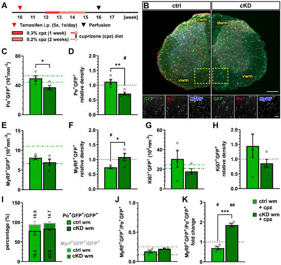The cuprizone model is a copper-chelating toxic model used to induce demyelination in the CNS, mimicking several aspects of human multiple sclerosis (MS), including demyelination, oligodendrocyte death, astrogliosis, microgliosis, OPC proliferation, and maturation [58,59]. The cuprizone-induced response in the spinal cord has been reported to be reduced compared to the other regions of the forebrain [60,61,62]. By virtue of the previous reports on the applicability of the model in the spinal cord, we modified the previously used 0.2% w/w cuprizone powder feeding model and fed the 12-week-old mice with a dose of 0.3% w/w cuprizone for one week and with a dose of 0.2% w/w for the two following weeks (Figure 3A).